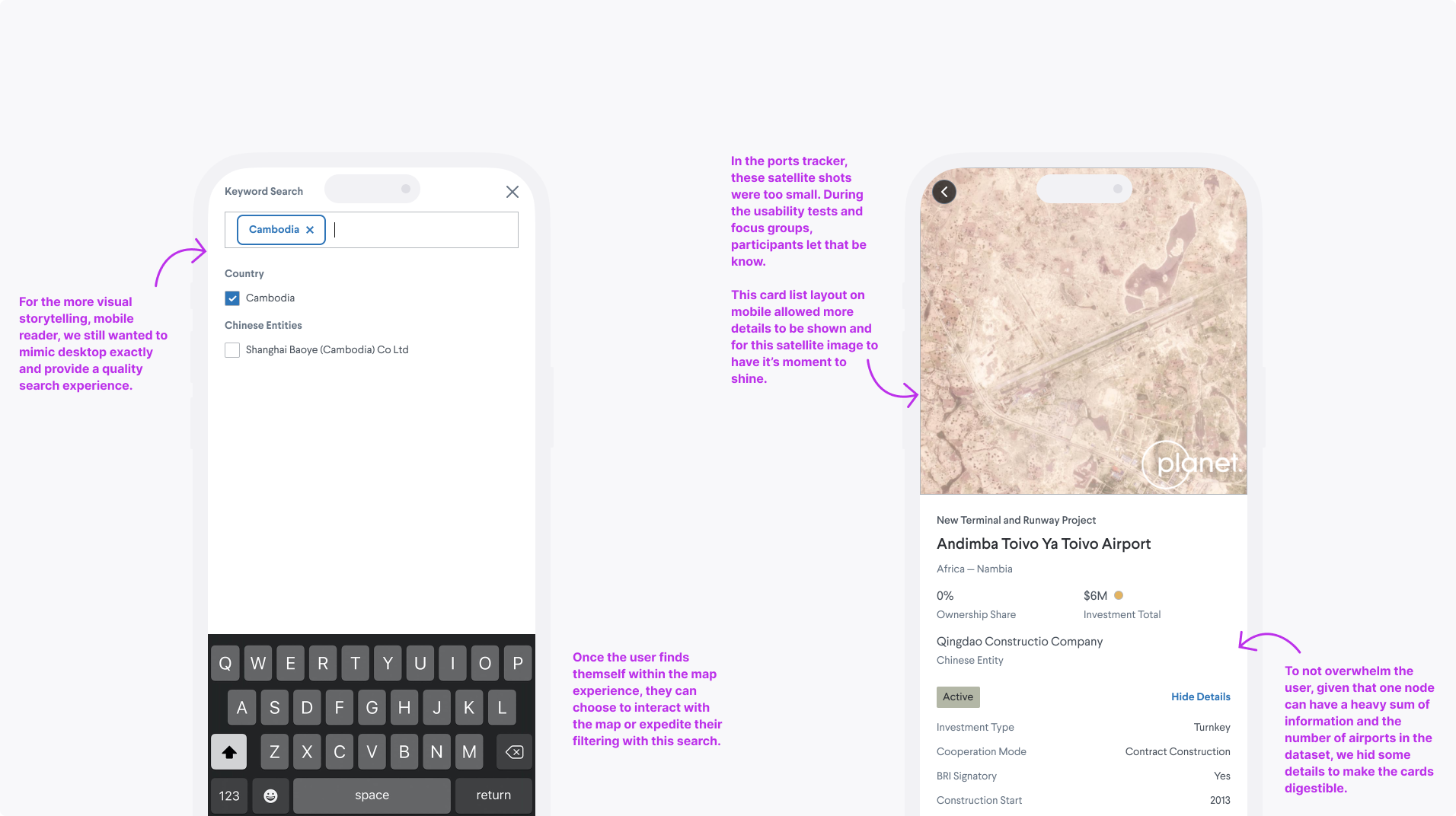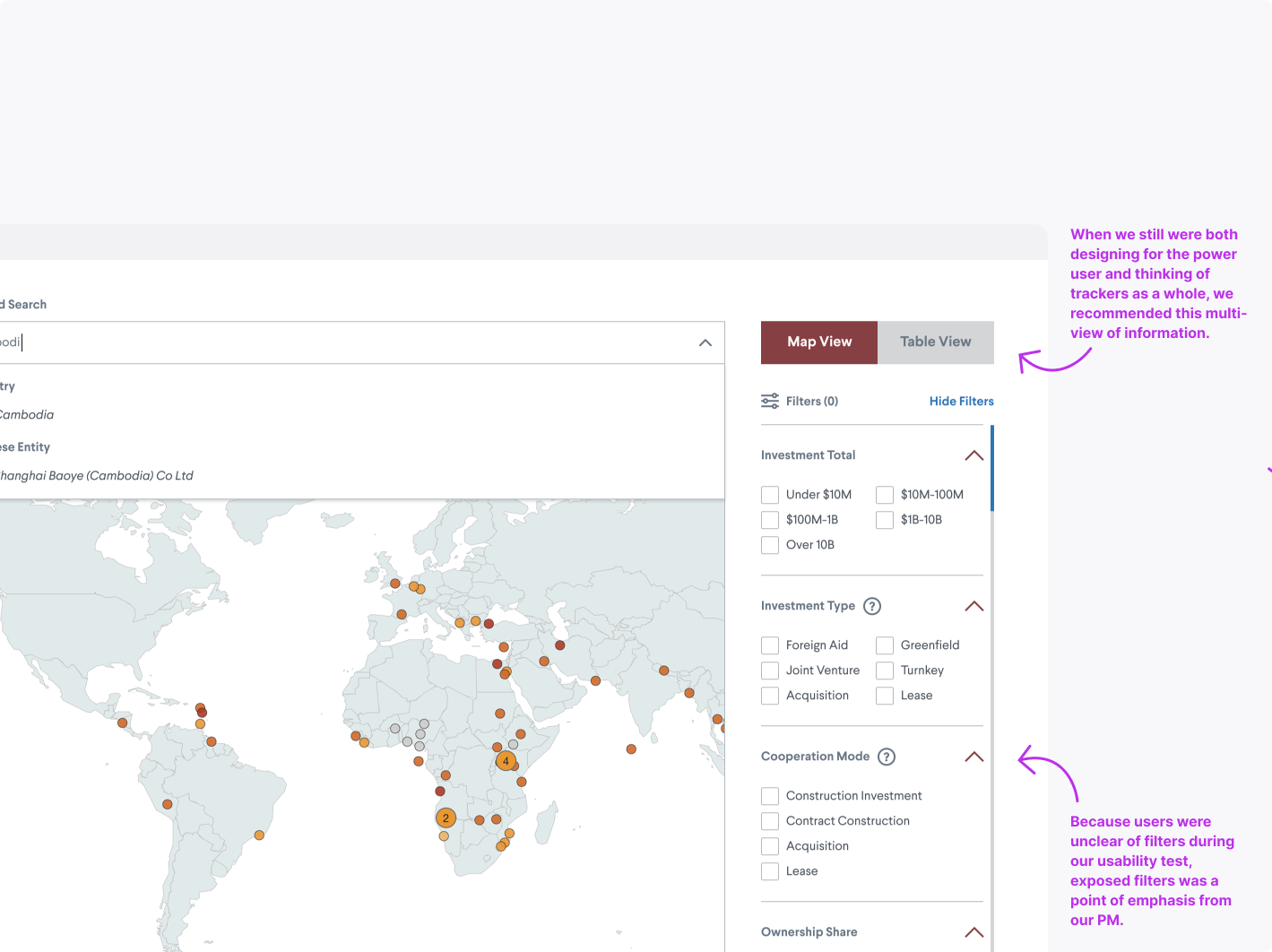Zongyuan Zoe Liu previously launched and found success releasing her interactive database for China’s overseas port ownership. Given the interest she built from people within military and commercial circles, she desired to deliver more with an interactive tracker of China’s investments in overseas airports. In this project, we were balancing feature enhancement and maintaining the customer loyalty already built.