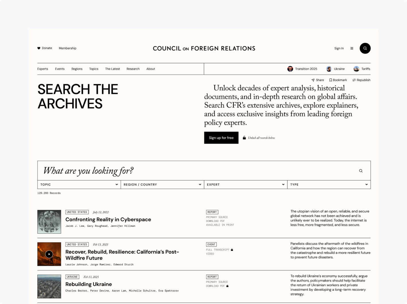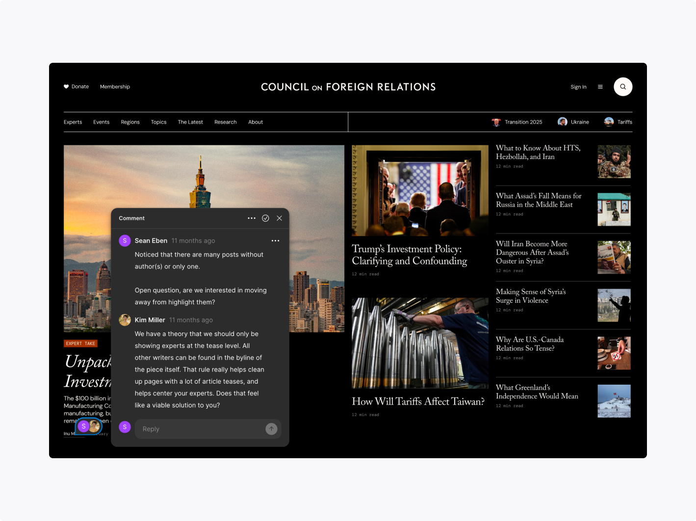 Given the new Executive regime, we pursued the large initiative of redesigning and re-platforming our entire website. We partnered with an outside vendor to design and develop this new visual language. In this project, we aimed to structure a new foundation that would allow CFR to build products more efficiently moving forward.